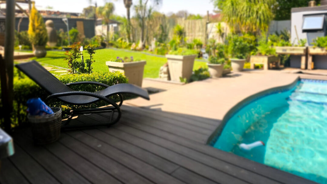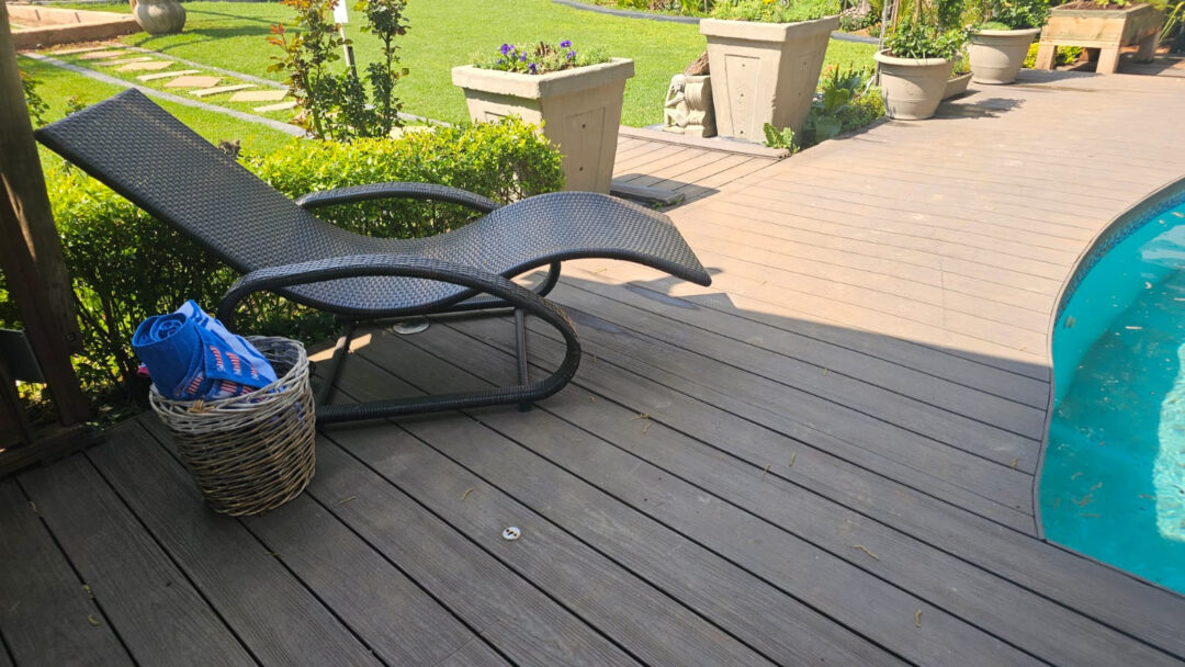 Gas braai, four-seater teak dining set, and a hanging chair for relaxed outdoor meals and gatherings.