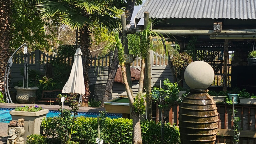 Deck area with a small boma, patio table with chairs, and a lush setting of palm trees, roses, and flowers. Private pedestrian gate for easy access.